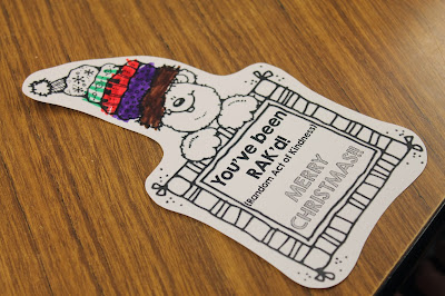 Each day, we "RAK'd" a classroom, teacher, custodian, para-professional, secretary, etc. The students helped by coloring our "You've been RAK'd!" cards, and counting out bookmarks and pencils. They couldn't wait each day to find out who we would be surprising. It was a blast!!